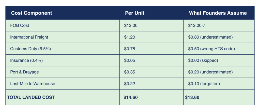 This is what your supplier quotes you. It covers manufacturing plus getting the product to the port of origin. Most founders think this is the hard part. It’s actually the easiest number to get right.